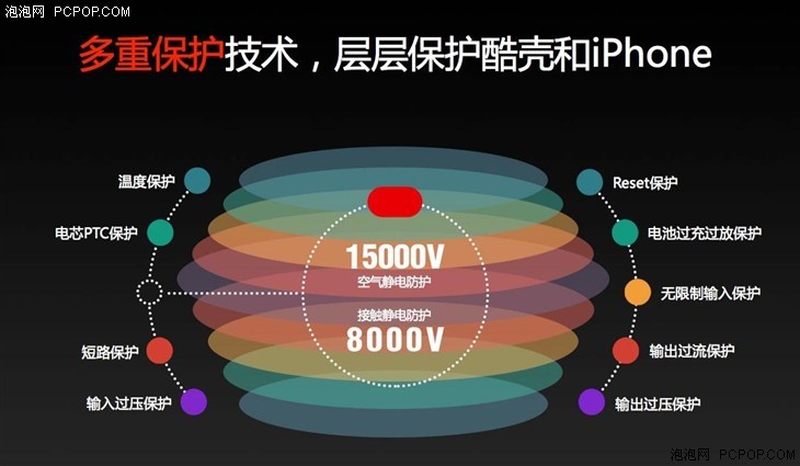 在有着优秀电池的同时,电池管理、保护芯片也至关重要。酷壳在从充电器输入、电池充电、酷壳电池向iPhone内置电池供电这三大环节均有着保护机制。在充/放电压、电流、温度、电量等等方面进行严密的控制,杜绝过充、过放、过压、过热等安全隐患。简单来说,就是通过尽可能多的保护措施,达到杜绝iPhone因为充电而出现故障(甚至爆炸)的情况。
