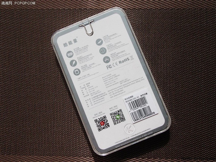 包装盒的背部清楚的写明了酷壳iPhone 6充电版的功能特性、产品参数以及款式等信息。它的标称电池容量为2400mAh(我们这次拿到的因为还是工程样品,其内置电池只有2200-2300mAh左右)。