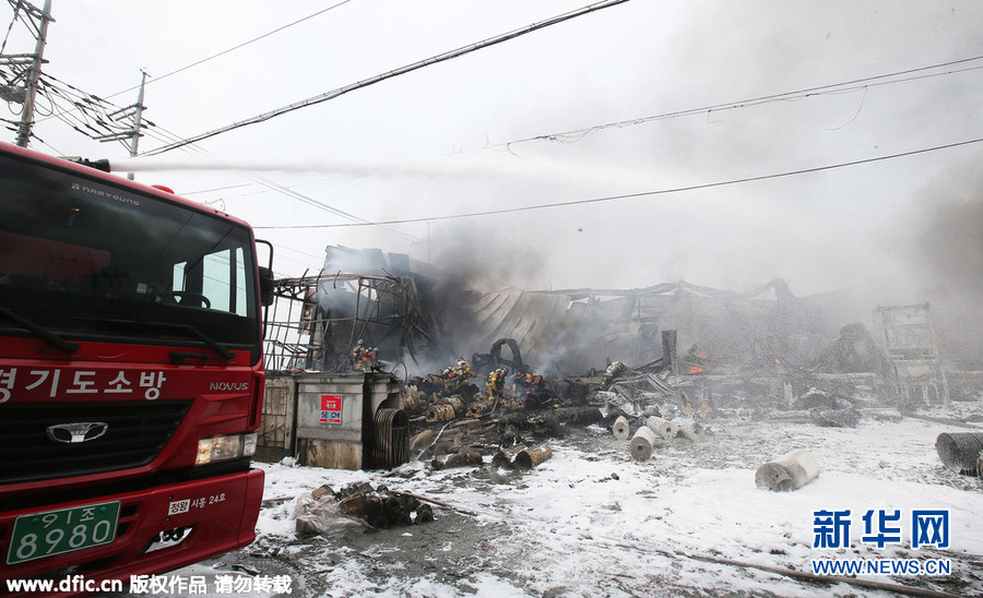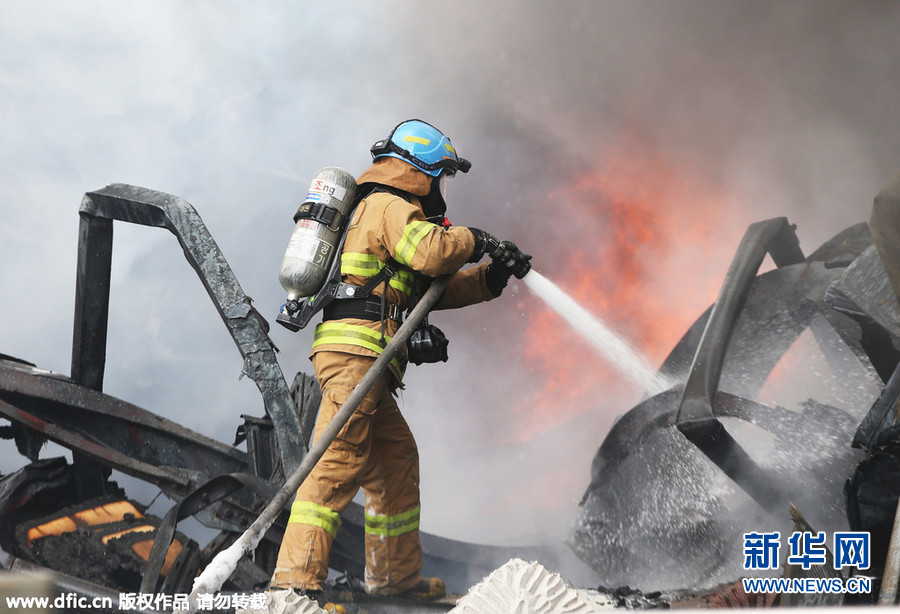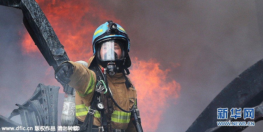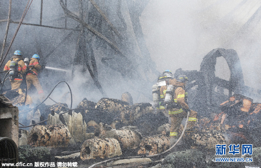 当地时间2015年9月11日,韩国安山,一工业园区内的胶片厂发生火灾,现场浓烟滚滚,消防员奋力扑救。图片来源:东方IC