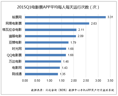 数据显示,从主流电影票APP的平均每人每天运行次数来看,哈票网以3.31次位居首位,网易电影票以2.63次位居第二位,格瓦拉@电影则以2.11次处于第三的位置。