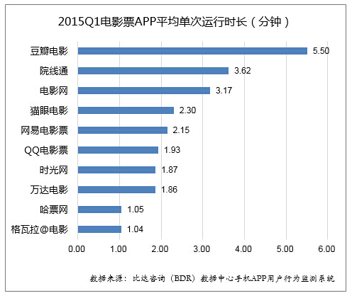 中国软件资讯网4月20日消息,根据比达咨询(BigData-Research)最新发布的《2015年第1季度电影APP用户监测报告》,2015年第一季度,哈票网的用户活跃度最高,平均每人每天运行次数达3.31次。豆瓣电影的用户粘性则最强,平均单次运行时长达5.5分钟。