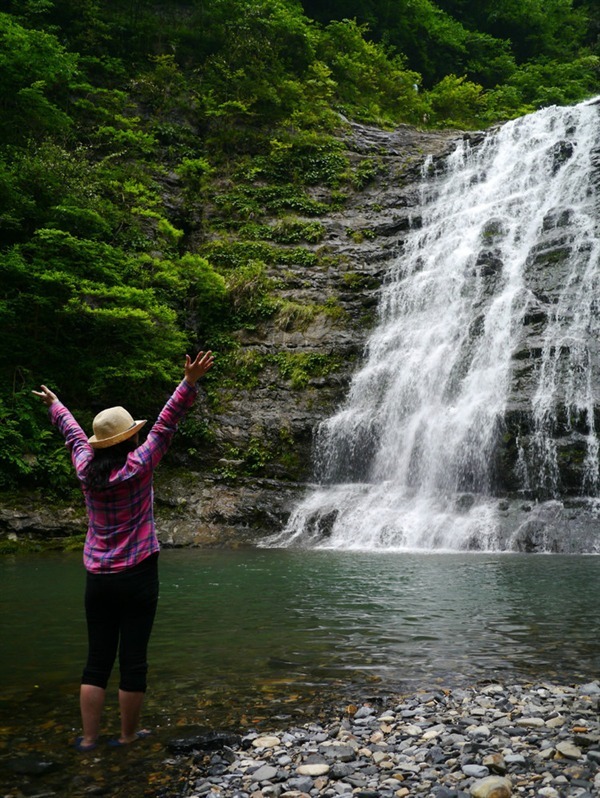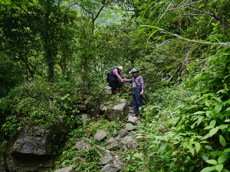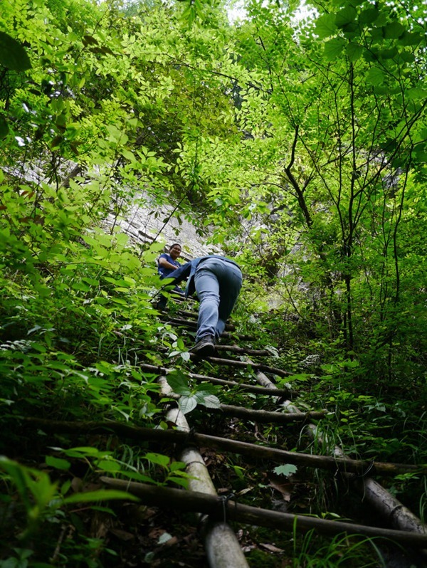 一路去往瀑布的路上,也有不少路障,比如这个几乎垂直九十度的坡,搭了一个简易的木梯子可以上上下下,承重能力一般,表示超过90kg可能就要咯擦了,千万不要和大吨位的小伙伴一起上下