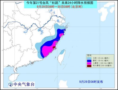 降雨预报:29日08时至30日08时,浙江东部和南部、福建、广东东北部、江西东南部和北部、台湾西北部等地有大雨或暴雨(见附图),其中,浙江东部沿海、福建东部和南部有大暴雨(100~180毫米),福建沿海局部地区有特大暴雨(250~260毫米)。