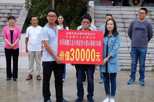 9月8日,新学期开学之际,由师宗团县委组织的“大手牵小手 爱心暖童心”爱心课桌捐赠仪式在五龙乡南岩完小举行,出席仪式的有师宗县人民政府副县长吕天敏、县委宣传部副部长黎双全、县妇联主席浦丽萍、团县委书记张渊超、曲靖市商业银行师宗支行副行长王雪华、社会爱心人士杨玉红及五龙乡、中心学校、南岩完小的领导。